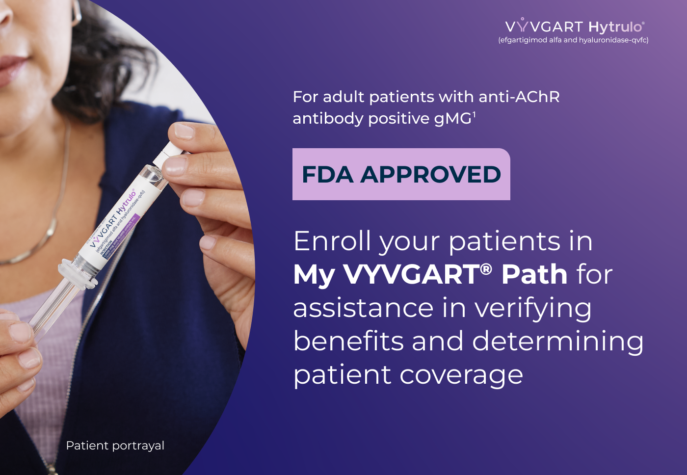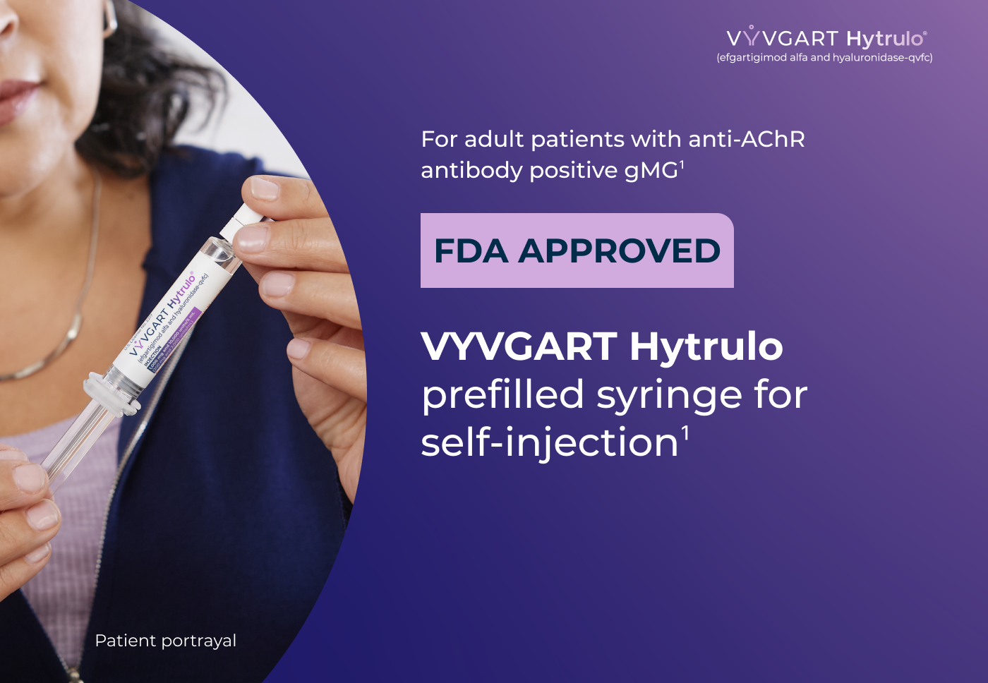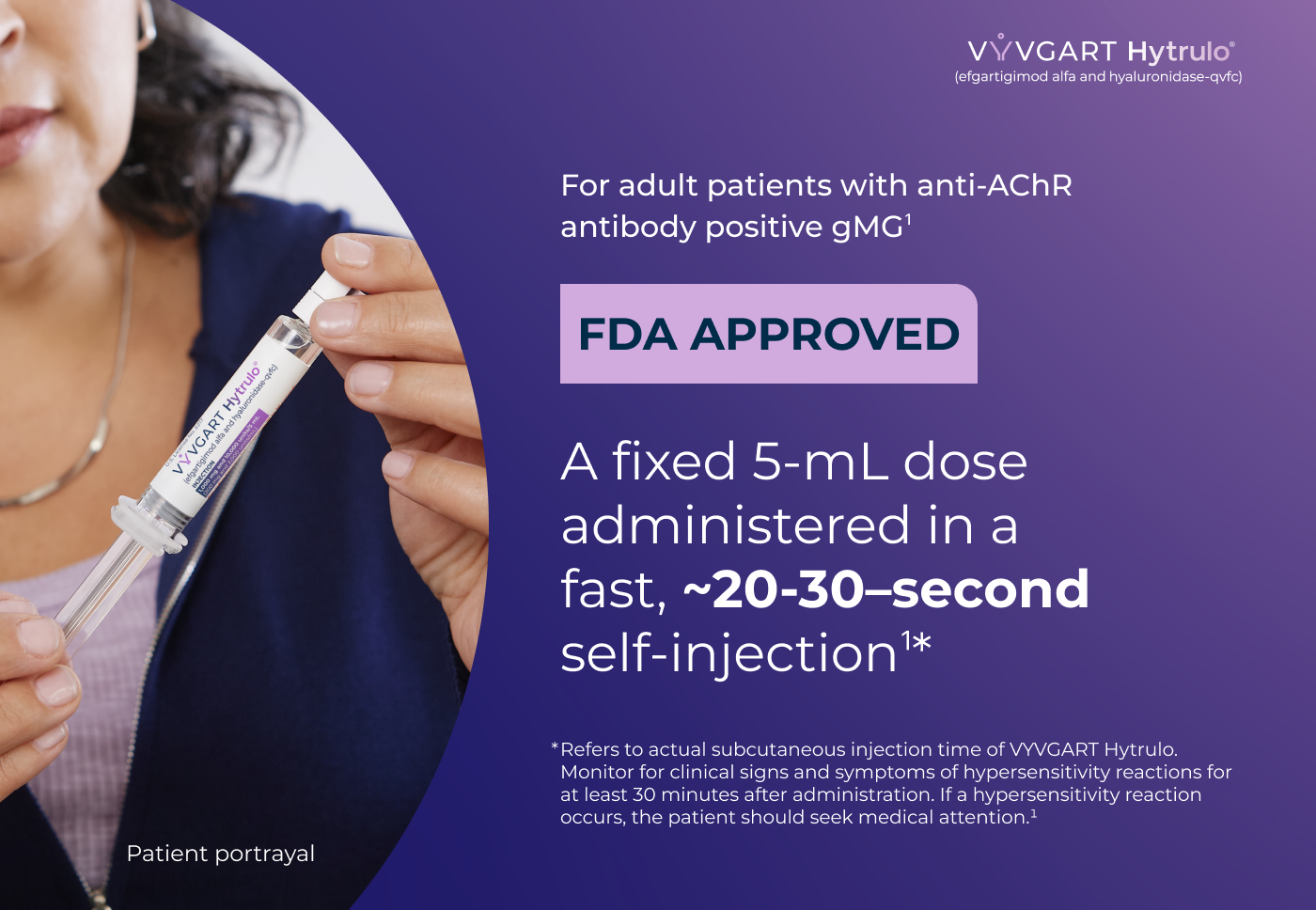 VYVGART HYTRULO® (efgartigimod alfa and hyaluronidase-qvfc) is indicated for the treatment of generalized myasthenia gravis in adult patients who are anti-acetylcholine receptor (AChR) antibody positive.